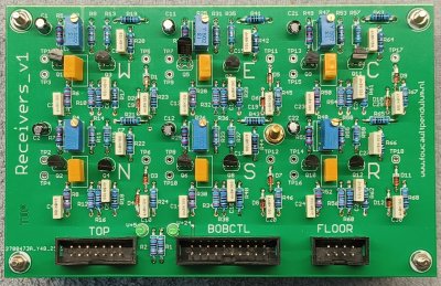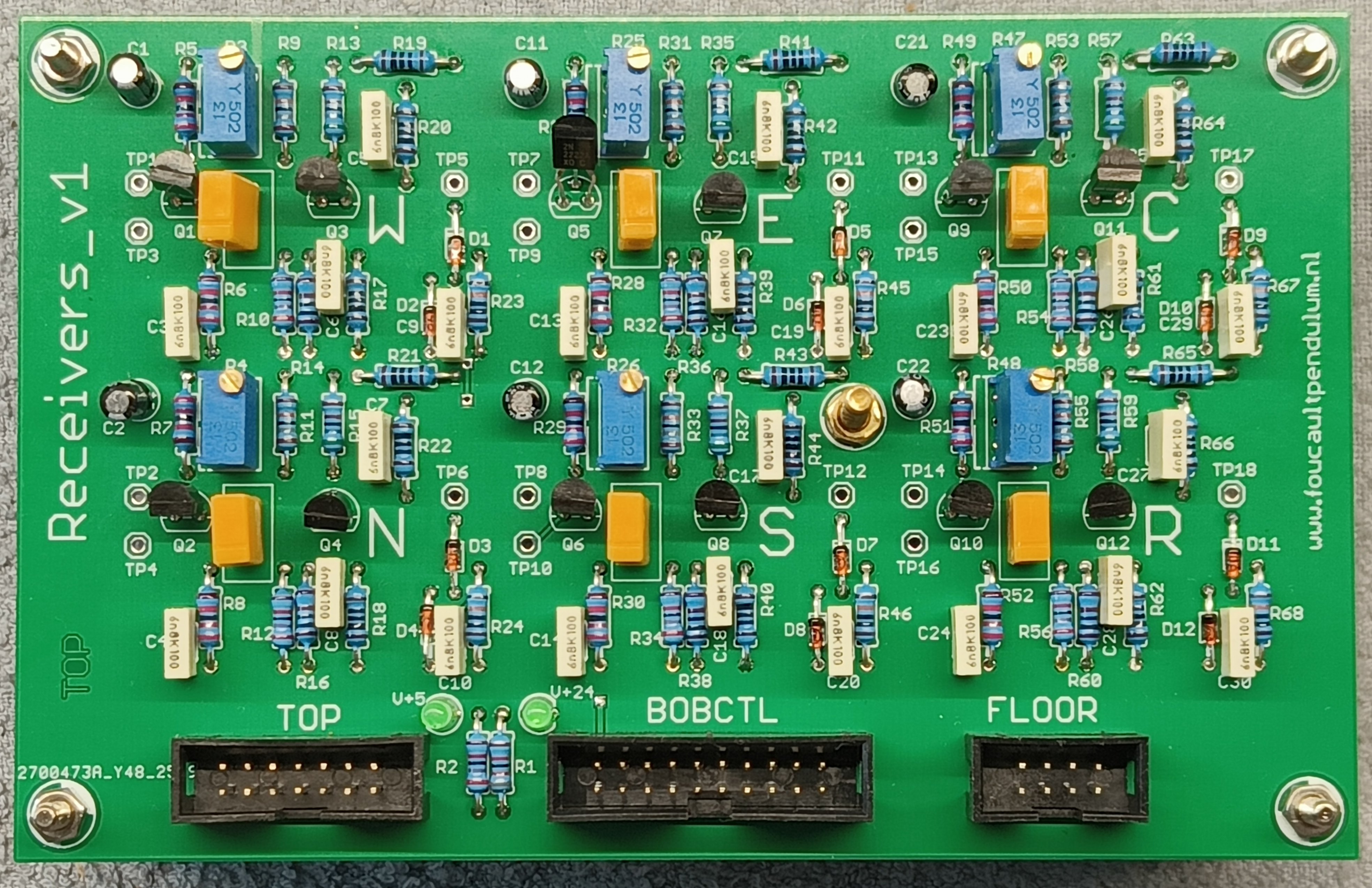 This board contains 6 identical receiver circuits with a bandwidth of a few kHz around the frequency of 465 kHz, together with an amplitude detection circuit. 4 receivers process the North, South, East, West signals from the PMS, the other 2 the signals form capacitive Center and/or Rim electrodes.
