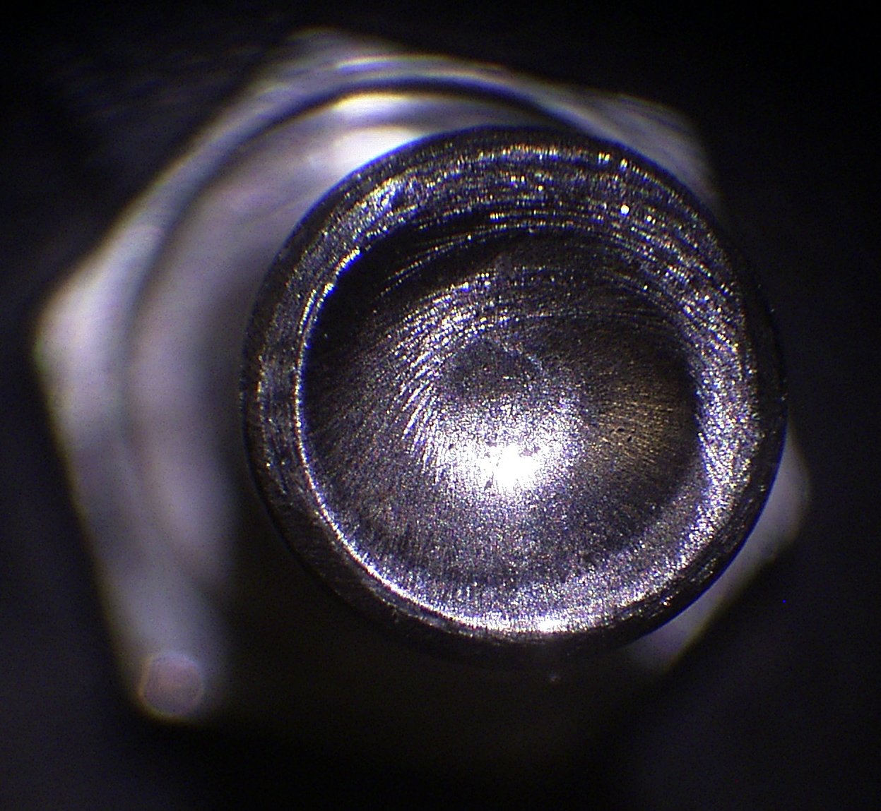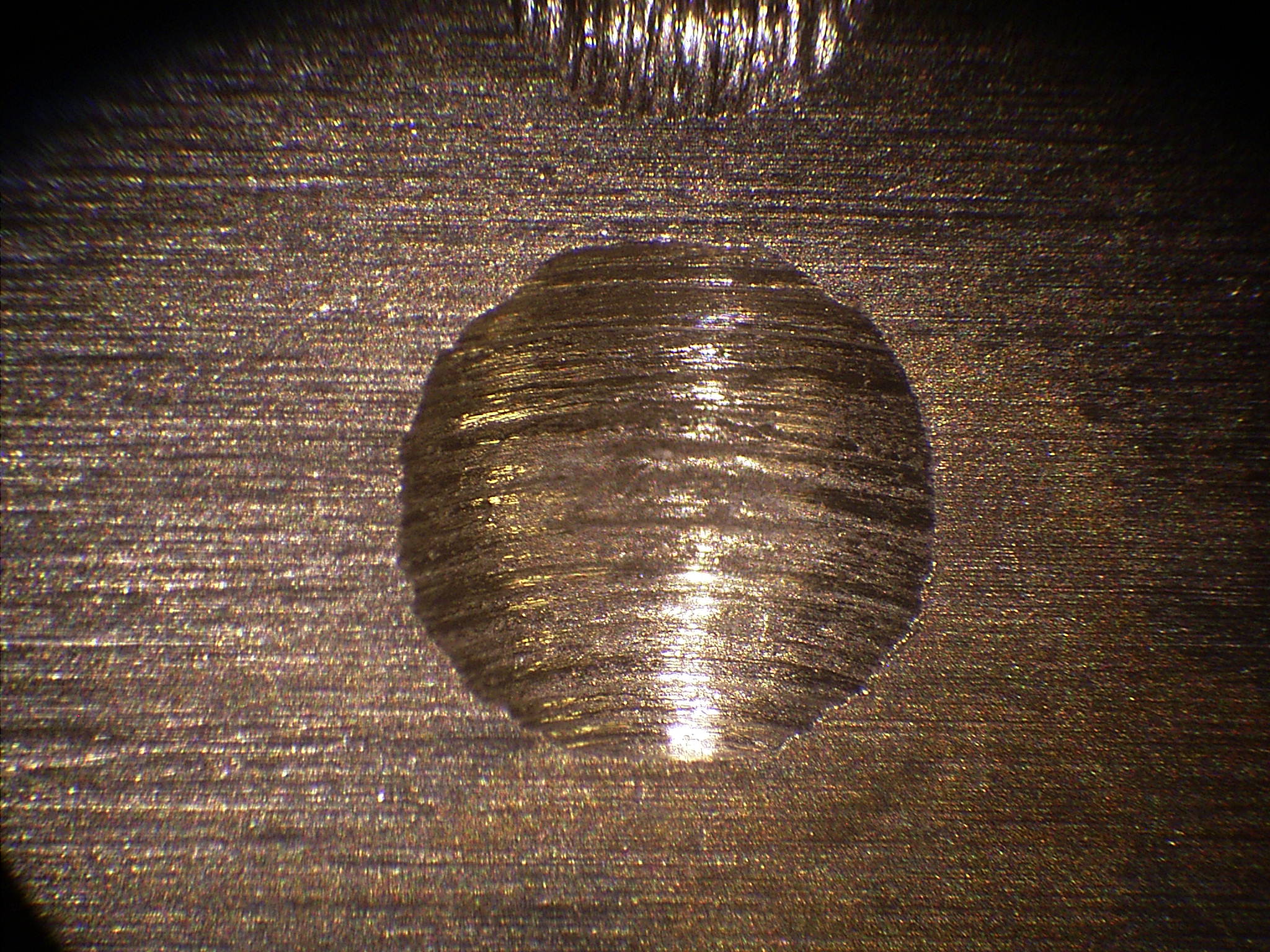 The pit in the chisel steel. ca. 2mm in diameter, made with a ball shaped diamond drill of 4 mm radius.