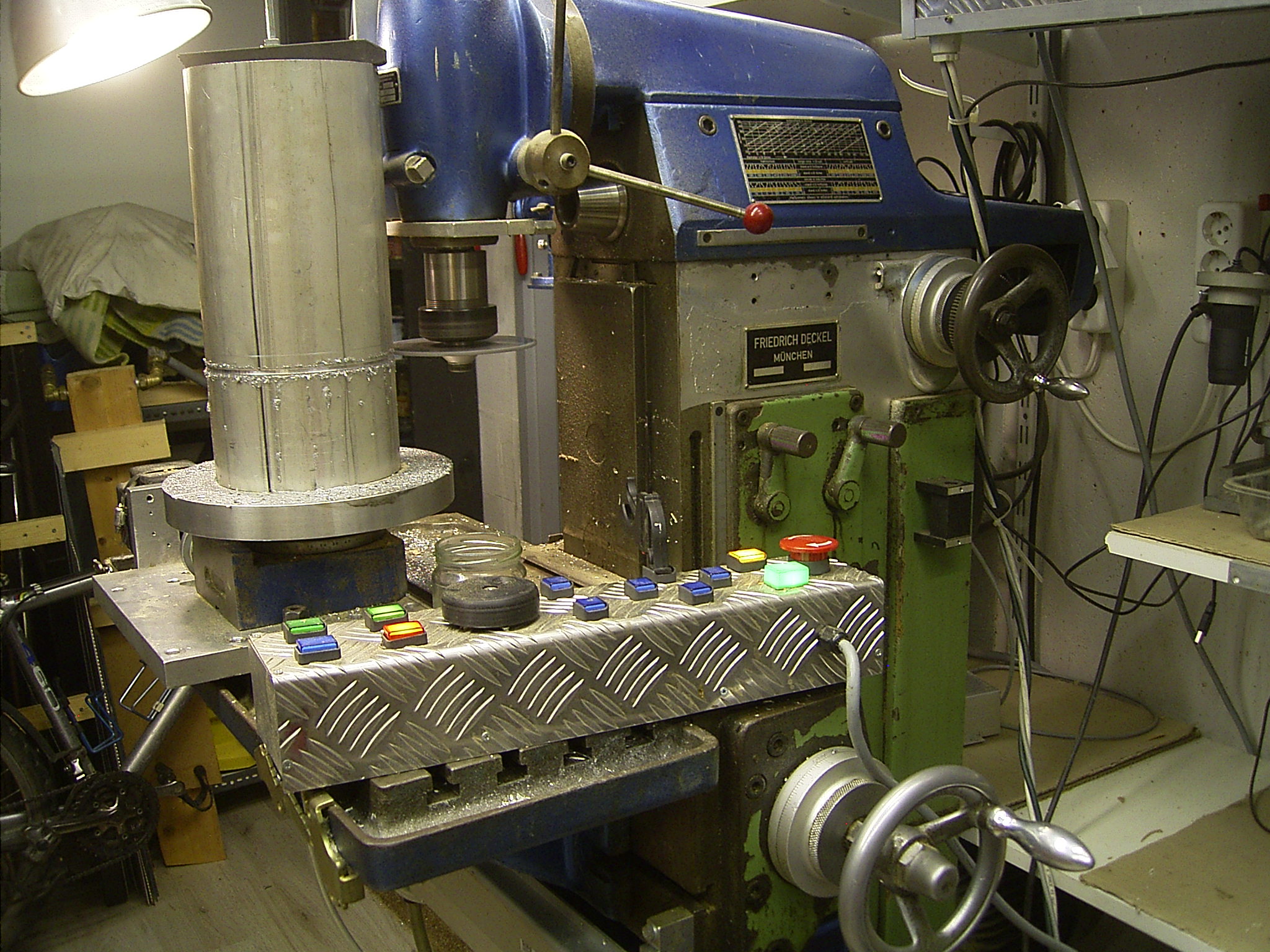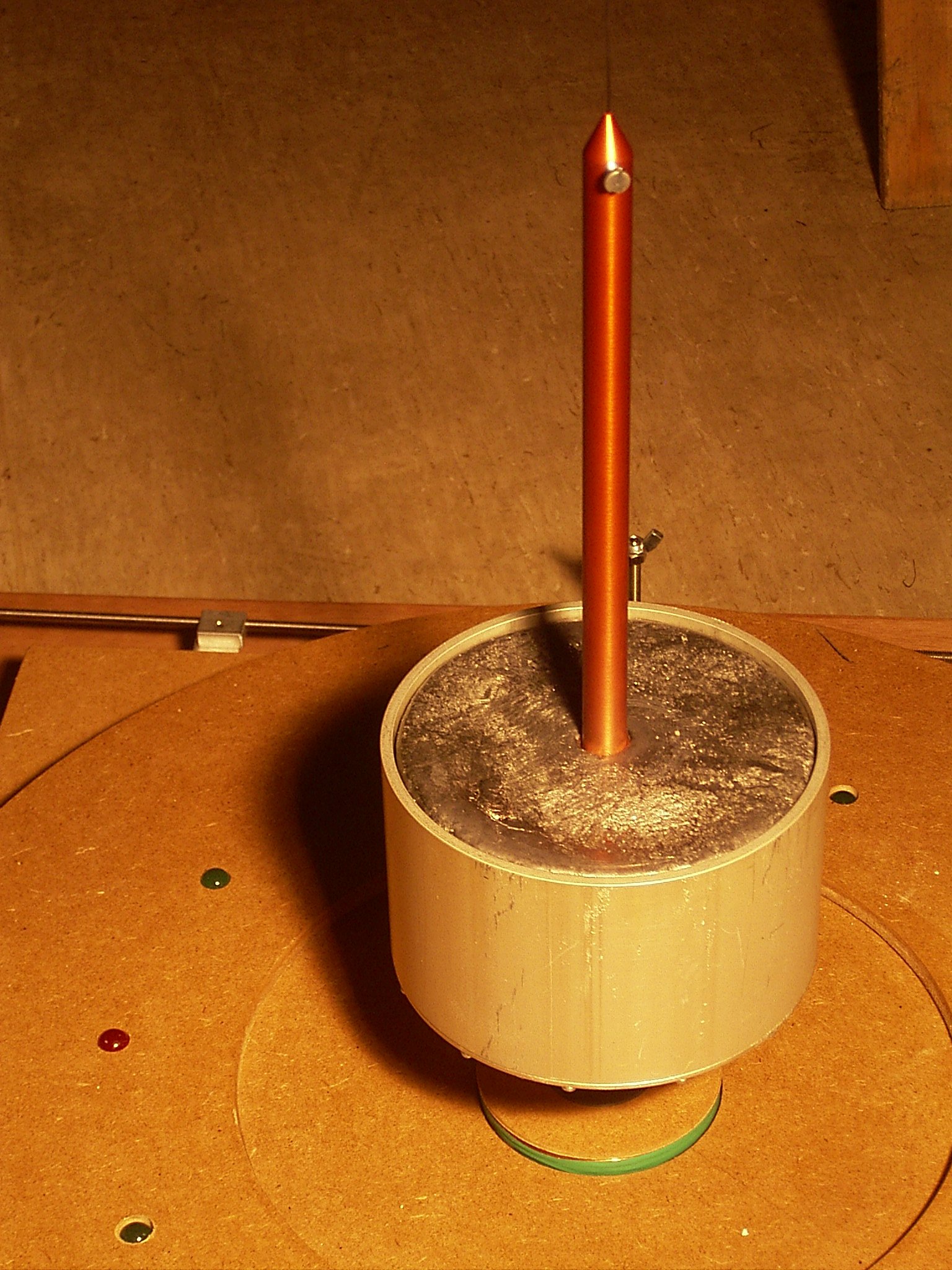 The bob is constructed from a piece of aluminium tube I happened to have, with 140 mm outer diameter and 4 mm wall thickness. The tube is closed at the bottom by a circular plate mounted with 12 M2.5 screws. In the middle is a two part aluminium stem of 14 mm diameter, the lower part adapts some magnets, the upper part is mounted to the cable. The volume inside the tube is filled with lead.