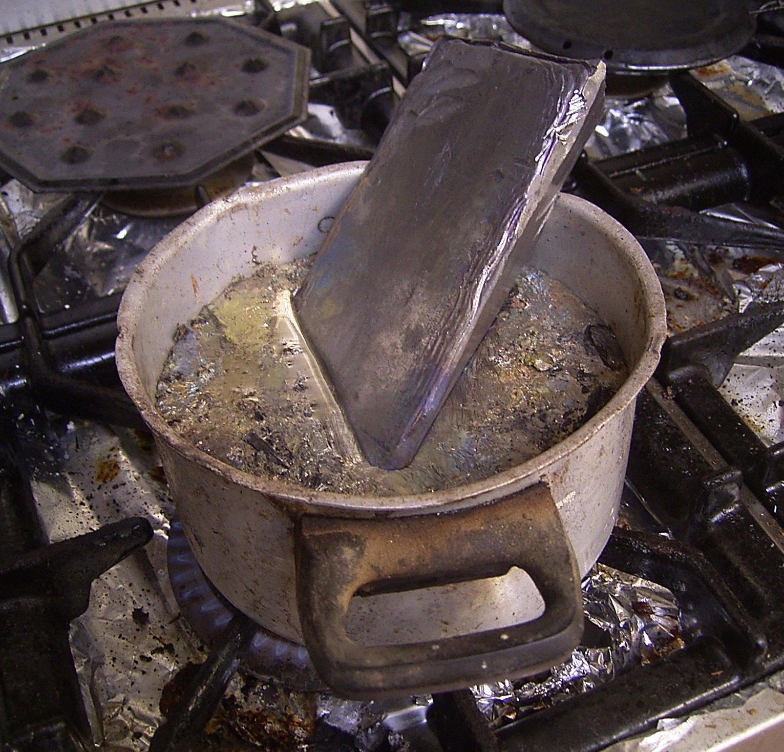 Be aware of the weight of such a meal. I used two pipewrenches to grip the pan for pouring the lead into the bob.
