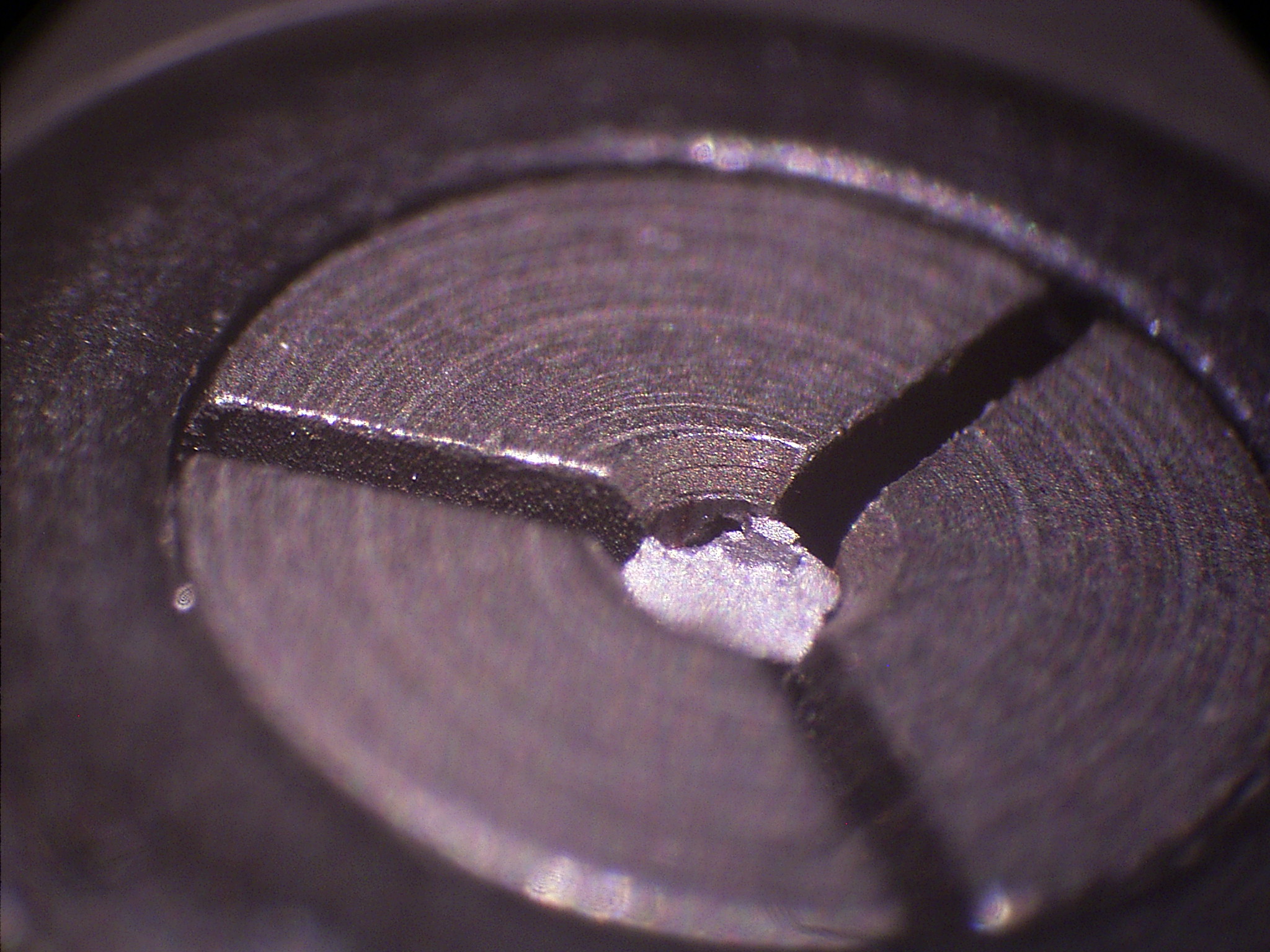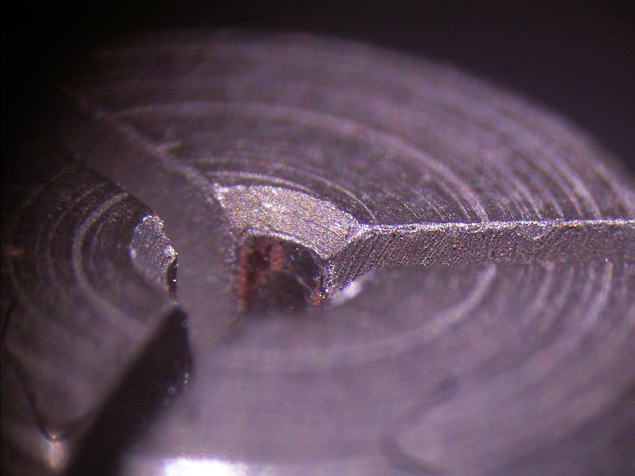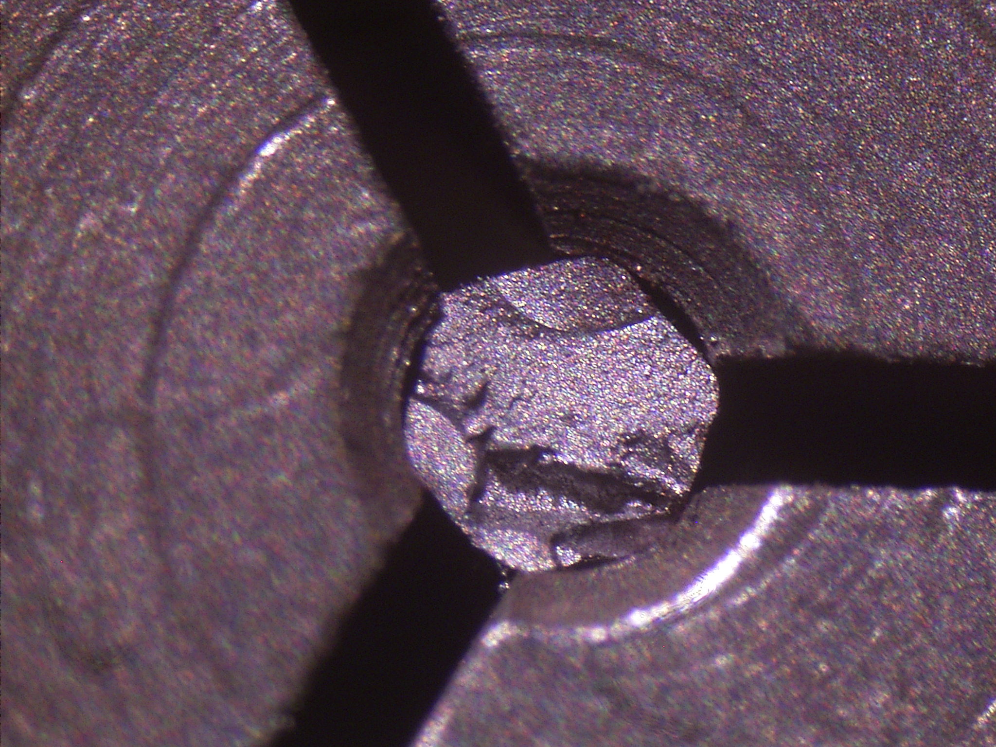 The fracture in the Proxxon clamp under the microscope. Clearly visible is that the wire broke at the edge of the clamping.
