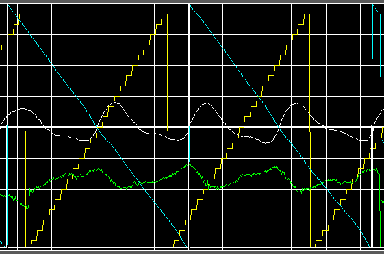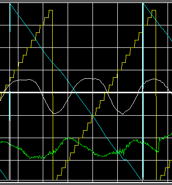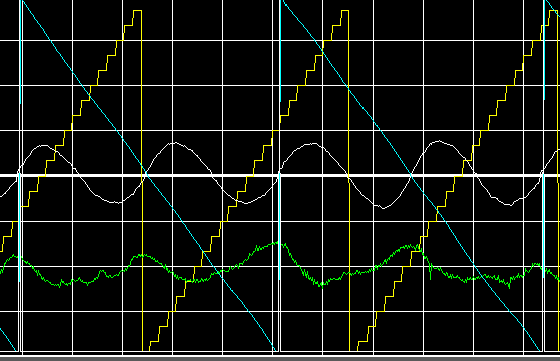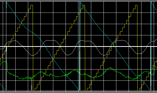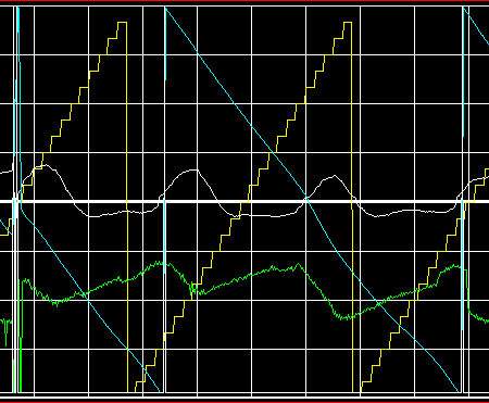 Green: Period time, offset : 4.1275 sec, scale 45 usec / div.