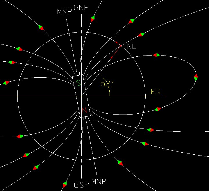 Here we see the GMF as if there were a big magnet inside the earth. The axis of this magnet is tilted approx. 180 + 11 degrees w.r.t. the earth's axis of rotation, indicated by GNP = Geographical North Pole, and GSP = Geographical South Pole. EQ identifies the equator.