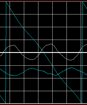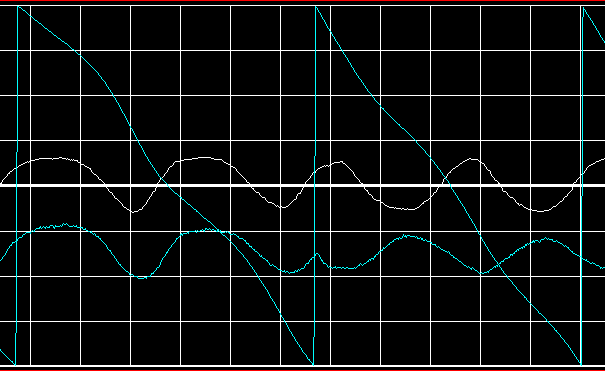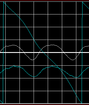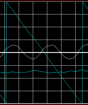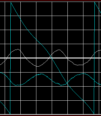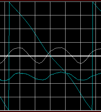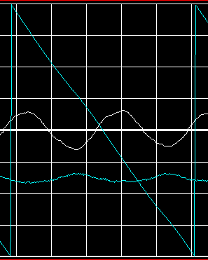 Blue; sine shaped line: First derivative of the precession angle = precession speed. Zero = midscale.