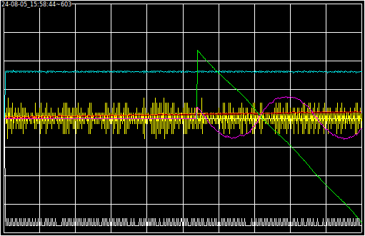 The yellow trace is the difference between the centerpass times of successive halfswings in 10 kHz ticks / pixel or 4.5 ms / div.